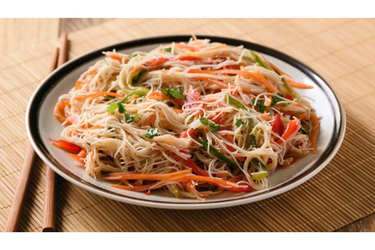 Coloque o macarrão em um bowl e deseje água quente e deixe por 2 minutos. Escorra o macarrão e leve para geladeira. Rale a cenoura e reserve. Desfie o kani-kama e reserve. Com ajuda de uma colher retire as sementes do pepino e corte em bastões bem fininhos e reserve. Pegue o macarrão, acrescente a cenoura, kani-kama, pepino e tempere com o molho de soja, suco do limão, pimenta-do-reino e azeite. Salpique o gergelim preto por cima e sirva gelado.