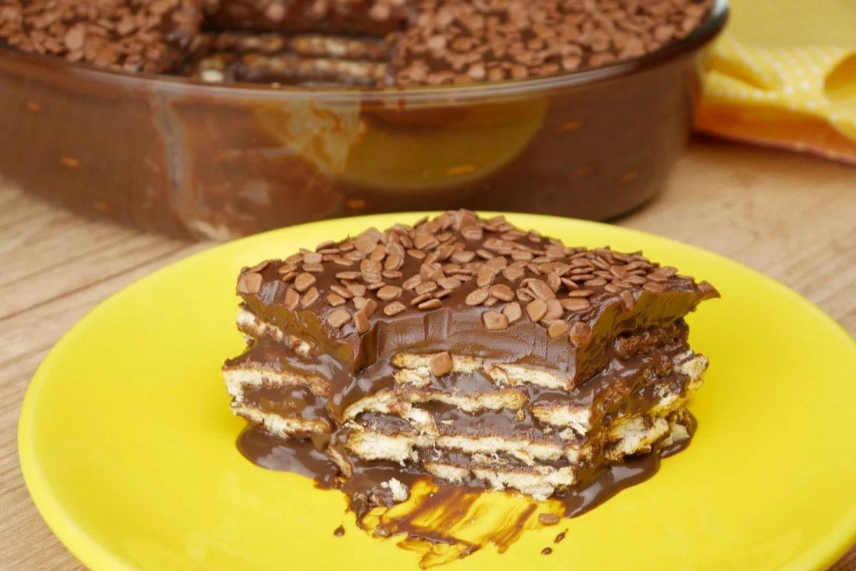 Coloque os ingredientes do creme branco (1/2 litro do leite, 4 colheres (sopa) de maisena, essência de baunilha e as colheres de açúcar branco) em uma panela e misture. Mexa constantemente em fogo baixo até ficar cremoso. Desligue o fogo e reserve. Faça o mesmo com os ingredientes do creme de chocolate em outra panela (1/2 litro de leite, o chocolate em barra, 1/2 xícara de açúcar, 4 colheres (sopa) de maisena e o cacau em pó), derretendo primeiro o chocolate em barra no leite. Reserve. Quando os dois estiverem em temperatura ambiente, comece a molhar as bolachas de maisena no suco e faça uma camada no fundo da travessa de vidro. Alterne as camadas entre bolacha e creme (bolacha, creme branco, bolacha, creme de chocolate) até que a camada superior seja a de chocolate. Decore com as castanhas. Deixe tampado na geladeira por aproximadamente 7 horas. Sirva ainda gelado.