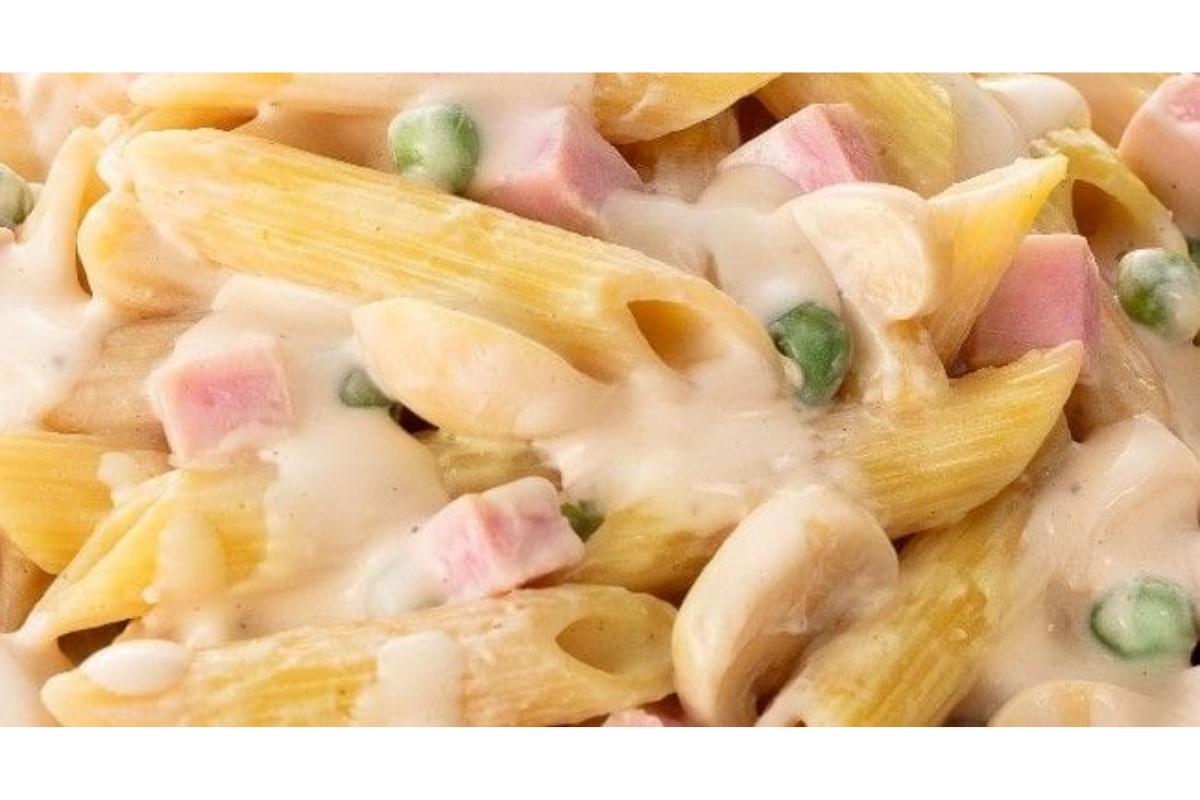 Em uma panela, cozinhe o macarrão em água fervente com sal até que fique “al dente”. Escorra bem e reserve. Em uma frigideira, derreta a manteiga, adicione a cebola e o alho. Depois adicione a linguiça calabresa e refogue tudo. Adicione o presunto e junte a ervilha com o champignon, o sal e a pimenta. Misture tudo novamente, muito bem. Acrescente o creme de leite, mexa sem parar. Adicione o macarrão cozido e reservado. Misture delicadamente. Sirva com o queijo parmesão ralado.