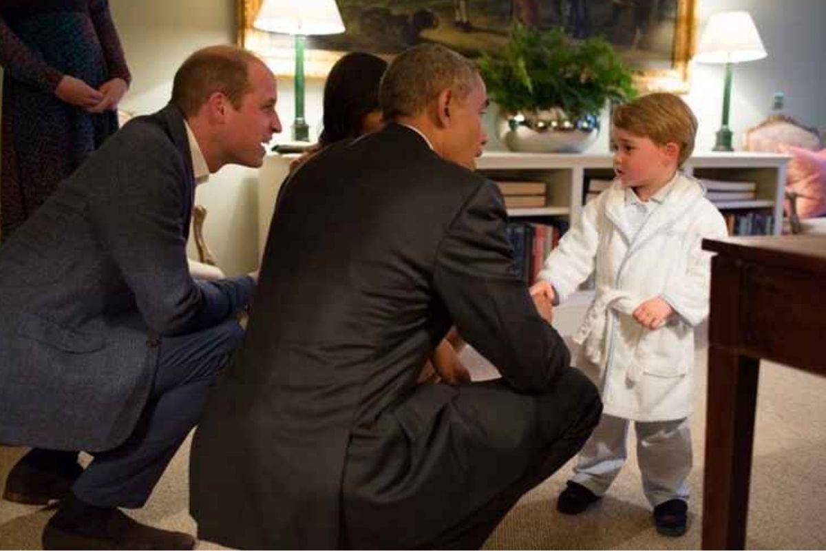 O ex-presidente dos Estados Unidos e sua esposa, Barack e Michelle Obama, foram recebidos no palácio de Kensington, em Londres, por George , que na época, surgiu vestindo um roupão. O momento encantou os fãs do pequeno, que com poucos anos, se mostrou muito capaz de um diálogo maduro.