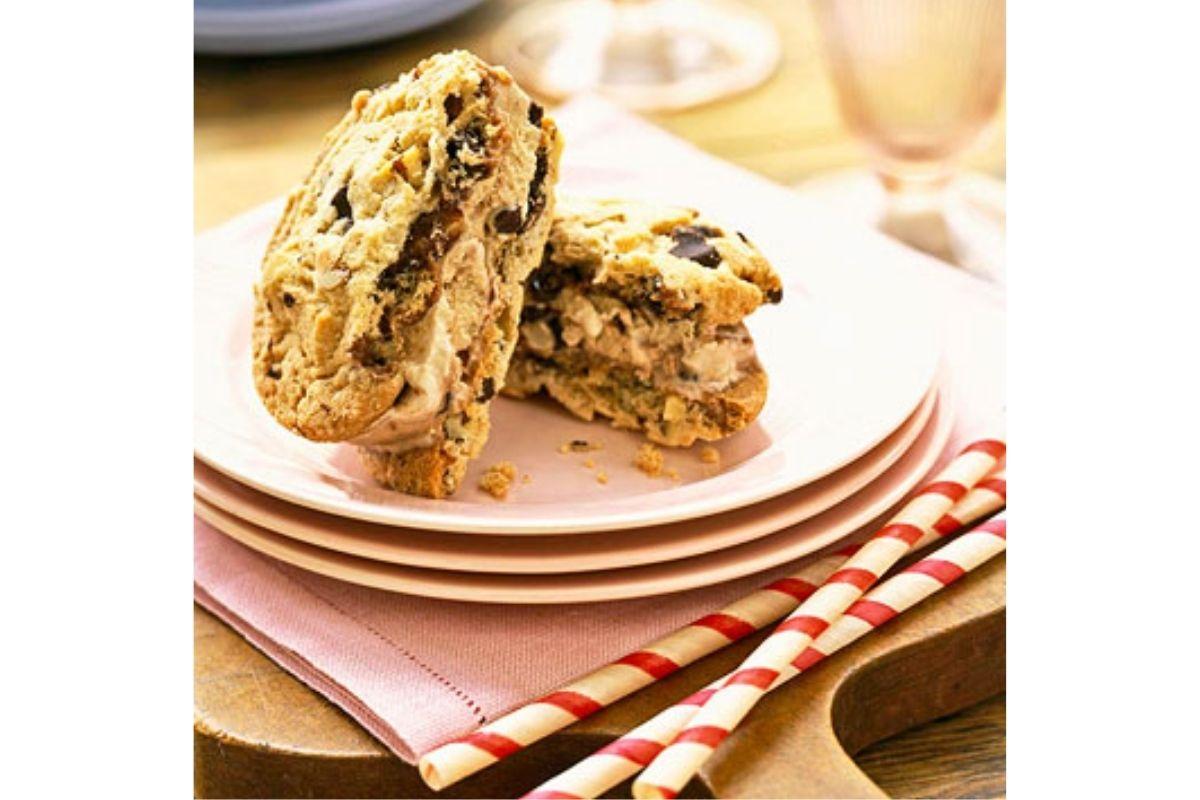 Com o auxílio de uma faca, retire o excesso das bordas e embrulhe o sanduíche de cookie em um plástico filme. Leve ao freezer por duas horas ou até que ele fique firme. Repita o processo com os outros três sanduíches. Antes de servir, retire os biscoitos do freezer por pelo menos 10 minutos.