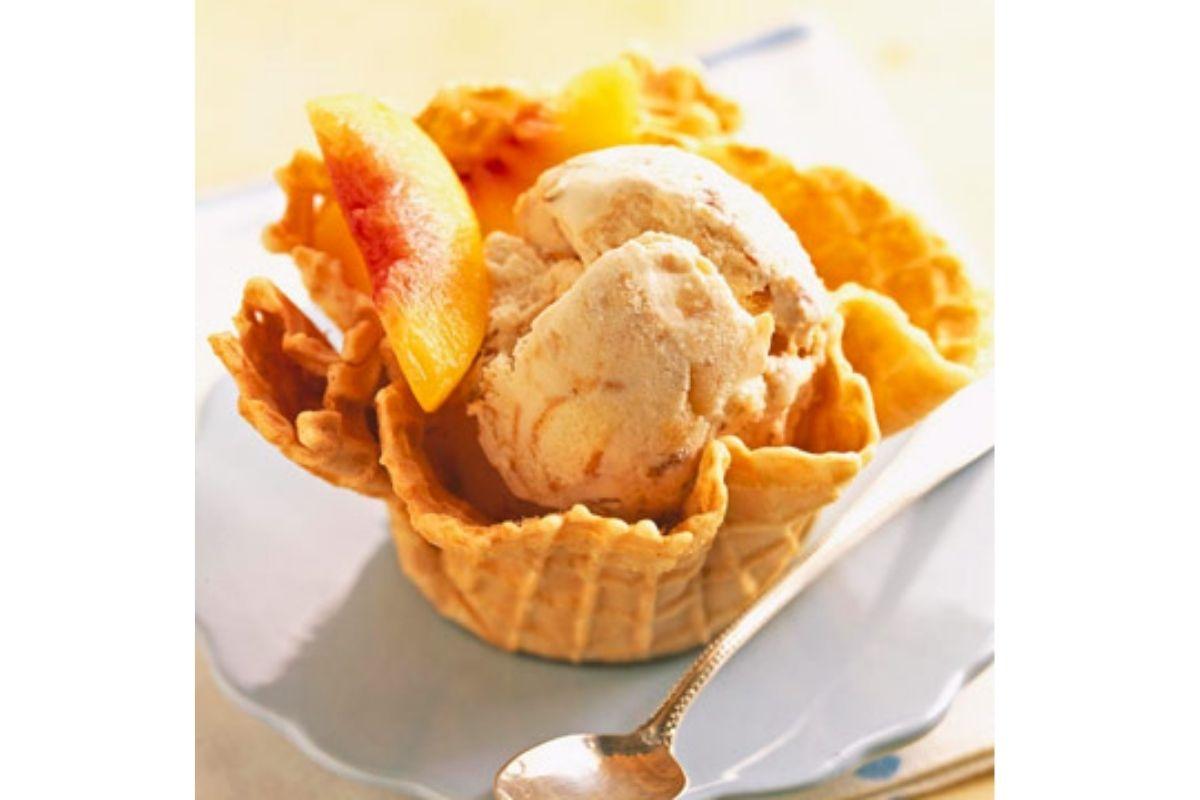 Pique os pedaços restantes do pêssego e em uma frigideira em fogo médio-alto leve as nozes até dourar. Deixe esfriar em um prato. Retire a mistura do freezer. Junte os pêssegos picados, as nozes, os pedaços de biscoito, a noz-moscada e a canela até ficar bem misturado. Congele por cerca de 6 horas ou durante a noite. Sirva em tigelas para waffle, se desejar.