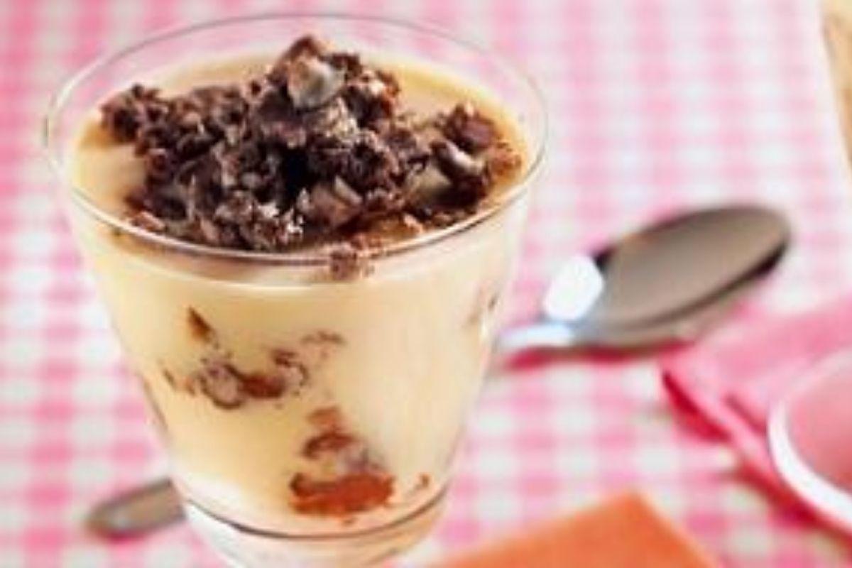 Quando os dois estiverem em temperatura ambiente, comece a molhar as bolachas de maisena no suco e faça uma camada no fundo da travessa de vidro. Alterne as camadas entre bolacha e creme (bolacha, creme branco, bolacha, creme de chocolate) até que a camada superior seja a de chocolate. Decore com as castanhas. Deixe tampado na geladeira por aproximadamente 7 horas. Sirva ainda gelado. Essa receita também pode ser encontrada em Tudo Gostoso