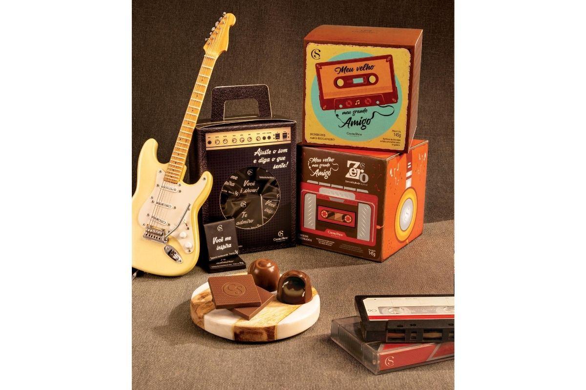 Quem não ama um bom chocolate? Para o dia dos pais deste ano, a Cacau Show preparou alguns produtos inspirados no mundo da música! Cada chocolate é vendido separadamente, mas, juntos, podem se transformar em um lindo kit para seu pai!