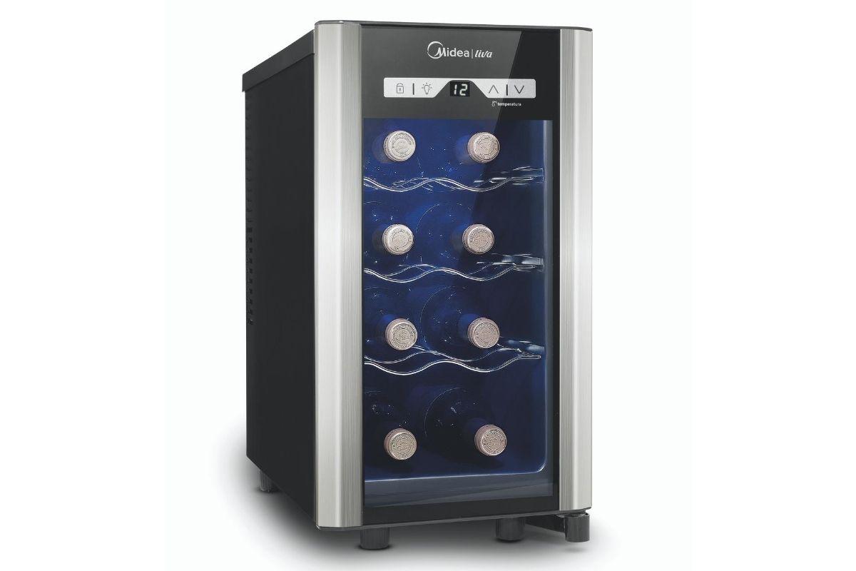 As adegas Midea são equipadas com sistema de refrigeração termoelétrico, não utiliza gás e não agride o meio ambiente, além de possibilitar o baixo consumo de energia. O equipamento tem acabamento em inox, prateleiras ajustáveis e iluminação de led interna.