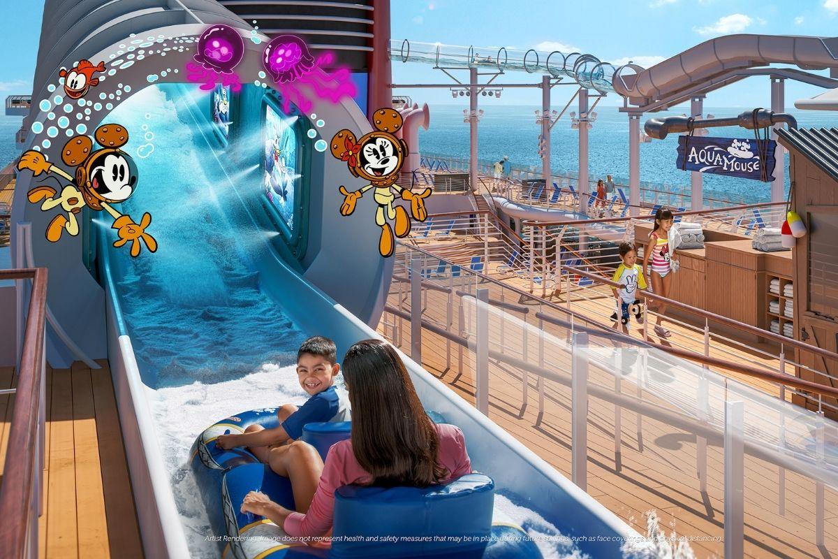 Esse é o AquaMouse, espaço com tobogã e que se transforma em palco para a atração aquática, com cenas de espetáculos, iluminação, efeitos especiais e surpresas (Foto: Divulgação / Disney)