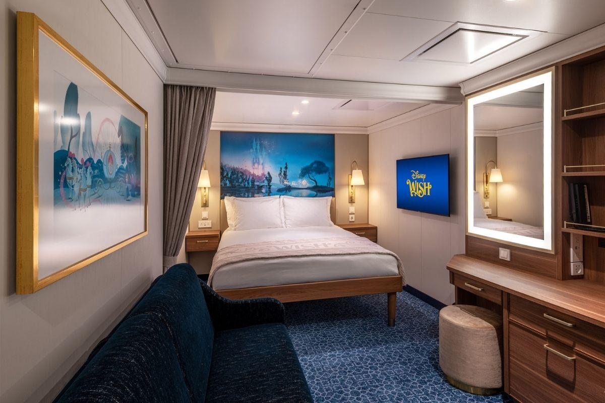 Com um visual totalmente novo e uma sensação de encanto e inspiração nas histórias da Disney, cada cabine a bordo do Disney Wish é um refúgio luxuoso e tranquilo, projetado com amplo espaço para famílias. A maioria apresentará o conceito de banheiro dividido exclusivo da Disney Cruise Line para máximo conforto. A maioria das cabines têm vista para o mar, sendo que 70% delas têm varanda, e alguns quartos têm a opção de portas que interligam uns aos outros – ideais para famílias ou grupos grandes que estão viajando juntos.