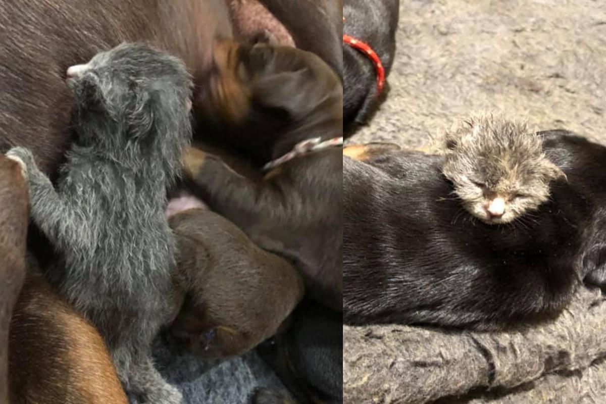 Um caso de adoção diferente viralizou na internet. Uma cadela Doberman chamada Ruby, além dos filhotes que deu á luz, adotou, acolheu e está amamentando uma pequena gata filhote, que foi abandonada com apenas 2 dias. As fotos que estão circulando mostram a filhote tomando leite diretamente de Ruby, ao lado dos outros irmãos cachorros.