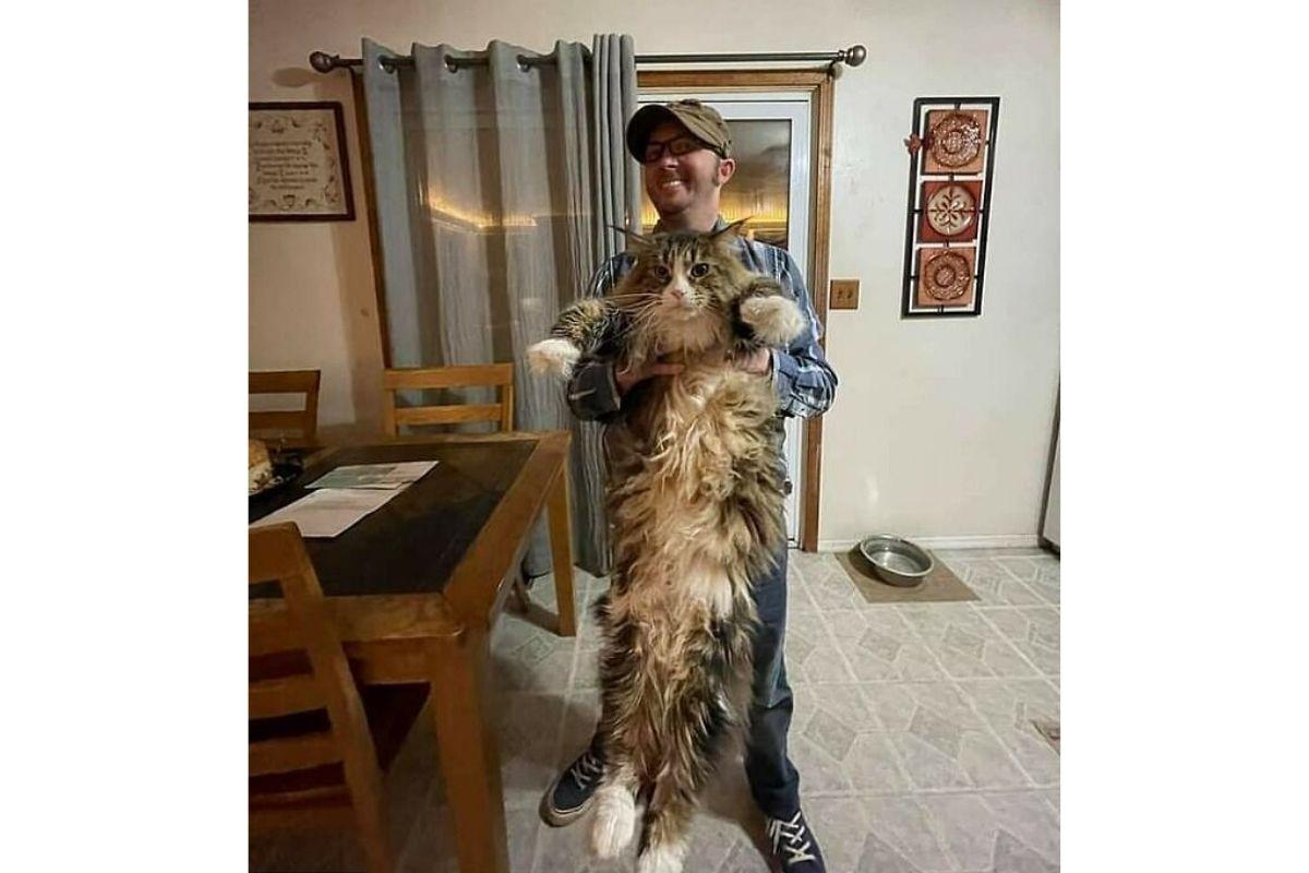 Uma das fotos mostra um pet que é quase do mesmo tamanho do dono quando fica ‘em pé’, outro que tem a pata tão grande quanto a mão do tutor e também um gato grande e peludo cobrindo o dono quase inteiro deitado na cama pelo tamanho surpreendente. Veja mais imagens abaixo.