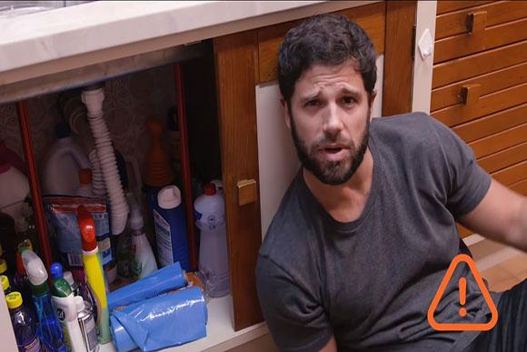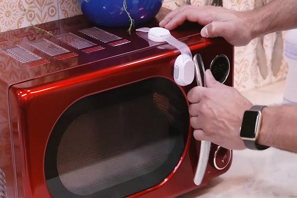 “A cozinha é um dos ambientes mais perigosos da casa da gente. Aqui nós mexemos com fogo, gás, faca, garfo, louça, vidro.” A dica dele vai para o forno microondas! “A criança pode achar que o cachorro ta com frio, o gatinho ta molhado, ou bota uma panela de metal aqui dentro, liga o negócio.” Ele descobriu uma trava manual que impede a criança de abrir o microondas sem supervisão dos pais.