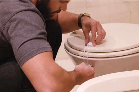 “A filha de uma amiga minha olhou esse vaso aqui [do banheiro] e falou ‘oh, olha que água pura da montanha, vou lavar as roupinhas da minha boneca‘ ai ela chegou e a menina tava lá lavando as roupinhas da boneca.” O mesmo lacre do microondas pode ser usada na privada, assim os perigos de lá ficam bem longe do seu filho.