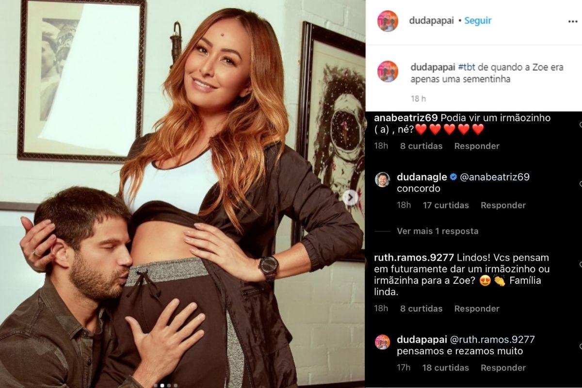 Nas imagens, Duda Nagle aparece ao lado da apresentadora, acariciando a barriga de grávida. “#tbt de quando a Zoe era apenas uma sementinha”, escreveu o ator na legenda da publicação. Diante das iamgens, os internautas se animaram com a possibilidade do casal dar um irmão para Zoe. “Podia vir um irmãozinho(a), né?”, disse uma; “Com a Zoe saindo das fraldas já dá pra ter mais um”, disse outra.