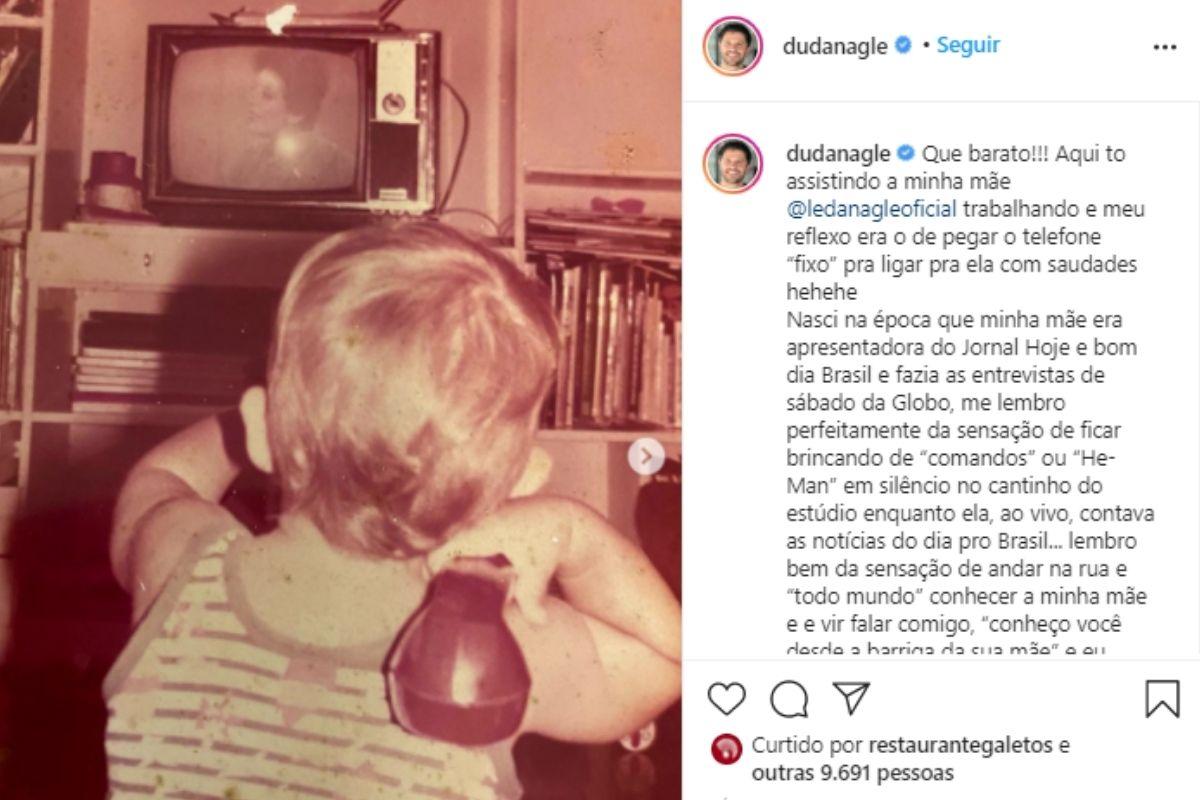 Na imagem, meio alaranjada devido a época, Duda aparece concentrado olhando para a televisão, enquanto segura um telefone. “Que barato!!! Aqui to assistindo a minha mãe, Leda Nagle, trabalhando e meu reflexo era o de pegar o telefone “fixo” pra ligar pra ela com saudades. Nasci na época que minha mãe era apresentadora do Jornal Hoje e bom dia Brasil e fazia as entrevistas de sábado da Globo, me lembro perfeitamente da sensação de ficar brincando de ‘comandos’ ou ‘He-Man’ em silêncio no cantinho do estúdio enquanto ela, ao vivo, contava as notícias do dia pro Brasil…”, começou.