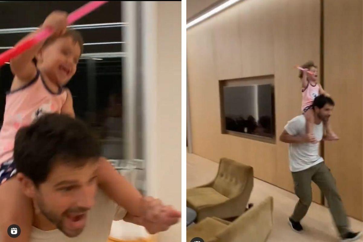O pai, aparece com a filha no ombro correndo pelos corredores da casa, mas a menina não fica assustada e mostrou que adora uma aventura. “Quero correr”. “Quer mais? Então segura”, avisou Duda, que logo em seguida, dispara novamente. Na legenda da publicação ele escreveu: “Quero mais correr”, legendou imitando a forma como a herdeira fala.
