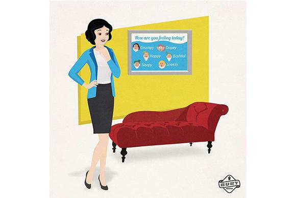 A Branca de Neve tornou-se psicóloga. Isto porque, em seu filme a princesa convivia com anões de diversas características. Quem não se lembra do Feliz, Zangado ou Dengoso? Mesmo com diferentes personalidades, ela sempre soube lidar muito bem com cada um deles e entender suas emoções.