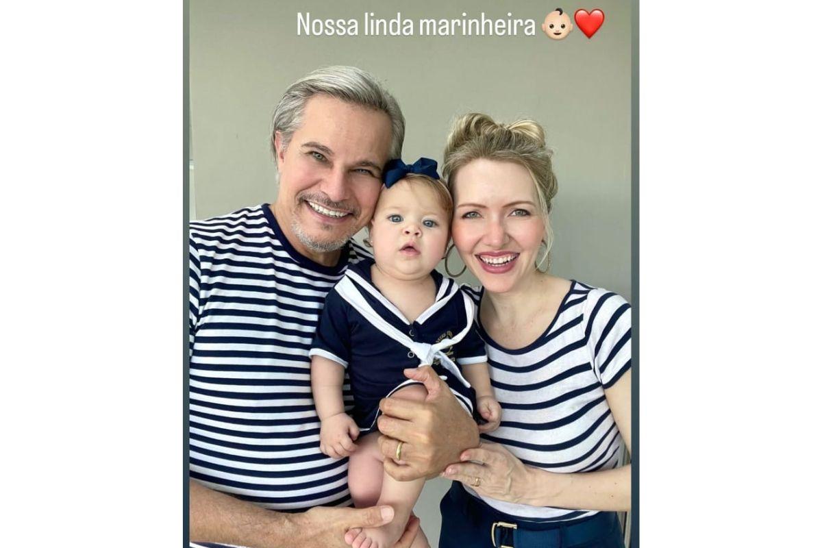 Na imagem a família aparece sorridente, com roupas combinando. “Nossa linda marinheira”, escreveu ele na legenda da publicação, feita através dos storys do Instagram. O casal aparece com camisetas listradas, azul e branco, enquanto a bebê aparece com uma linda roupa de marinheiro e um laço na cabeça.