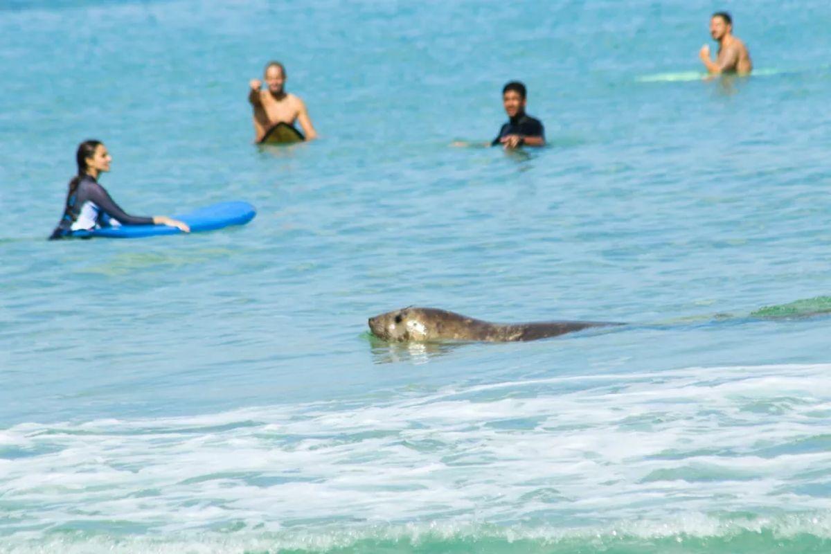 Banhistas aproveitam momento ao lado do animal (Foto: Reprodução/ Instagram @helenabarretoph)
