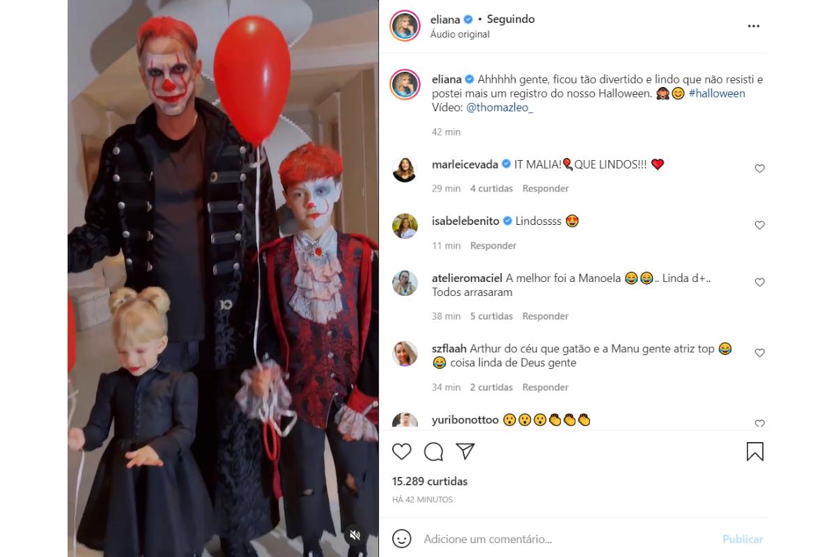 A artista também surpreendeu os seguidores ao aparecer com a filha Manuela, 4, fantasiadas para o Halloween. Na legenda, a apresentadora escreveu: “It que que se cuide!”. Eliana também havia mostrado nos stories toda a preparação dela e da filha para a festa.