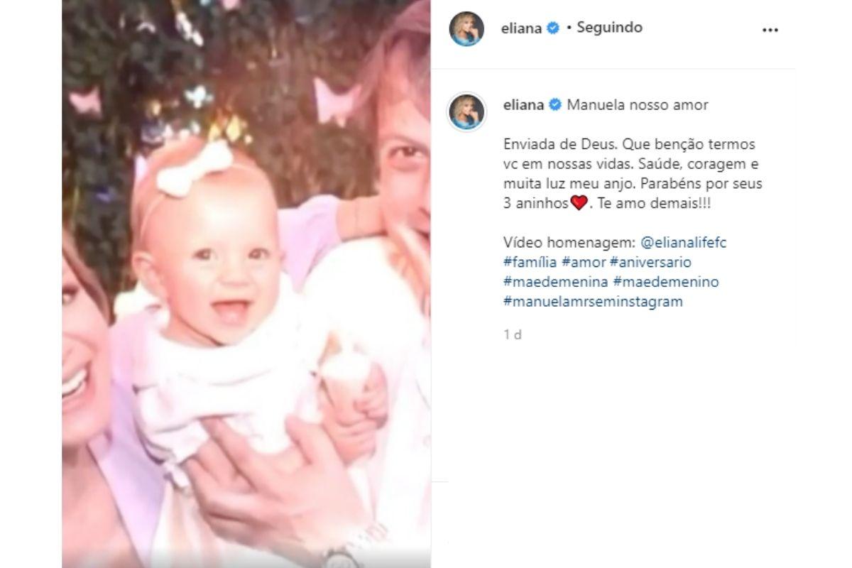 Nas imagens é possível ver todo o crescimento da Manu, desde recém-nascida até o último aniversário. “Manuela nosso amor. Enviada de Deus. Que benção termos vc em nossas vidas. Saúde, coragem e muita luz meu anjo. Parabéns por seus 3 aninhos. Te amo demais!!!”, escreveu Eliana.