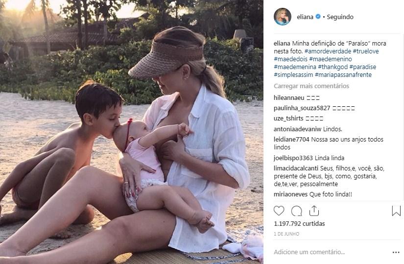 Hoje Eliana se sente realizada tanto na vida profissional quanto pessoal. Mãe de duas crianças, Manuela, de 1 ano, e Arthur, de 7 anos, a apresentadora costuma postar várias fotos dos filhos agradecendo pela oportunidade de ser mãe. “Minha definição de paraíso mora nessa foto”, escreveu em uma legenda.