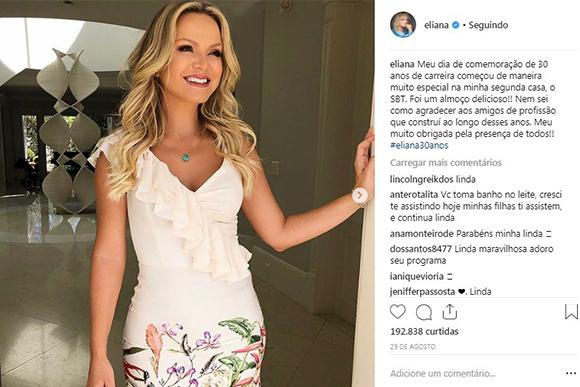 De acordo com a apresentadora, fez nesses 30 anos de profissão tudo o que gostaria de assistir na TV da casa dele, o que gostaria de mostrar para os filhos. “Do meu início, conservo a humildade e a vontade de aprender, de estar alerta às conversar, ao que o telespectador deseja”, disse Eliana em entrevista ao jornal Extra.