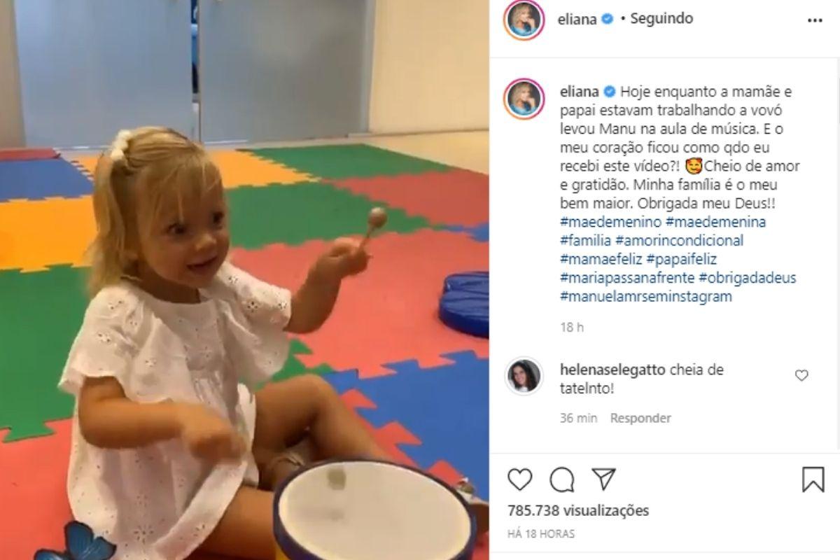 A apresentadora Eliana usou as redes sociais na última quinta-feira, 1 de outubro, para compartilhar um vídeo cheio de amor da filha, Manu, de 3 anos. Nas imagens, a criança aparece se divertindo muito durante uma aula de música, brincando com bolhas de sabão, tambores e chocalhos. Na legenda, a famosa fez uma declaração para a filha e contou que o avô que levou a garota para a aula.