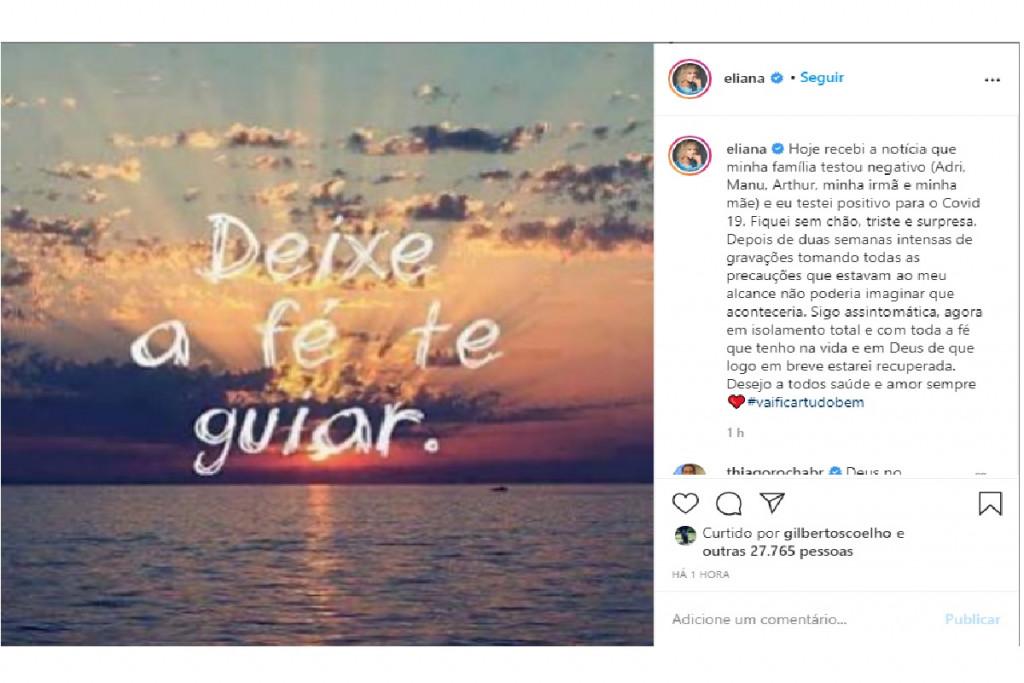 Eliana falou sobre o diagnóstico.”Fiquei sem chão, triste e surpresa. Depois de duas semanas intensas de gravações tomando todas as precauções que estavam ao meu alcance não poderia imaginar que aconteceria. Sigo assintomática, agora em isolamento total e com toda a fé que tenho na vida e em Deus de que logo em breve estarei recuperada. Desejo a todos saúde e amor sempre”, escreveu.