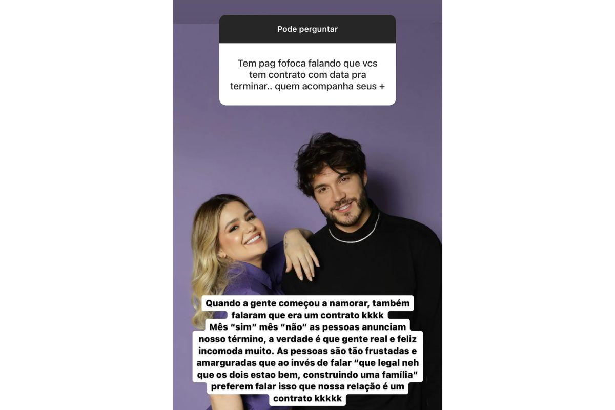“Quando a gente começou a namorar, também falaram que era um contrato. Mês sim, mês não, as pessoas anunciam o nosso término. A verdade é que gente real e feliz incomoda muito. As pessoas são tão frustradas e amarguradas que ao invés de falar ‘ah que legal que os dois estão bem, construindo uma família‘, preferem falar que nossa relação é um contrato”, escreveu ele por meio dos stories no Instagram.