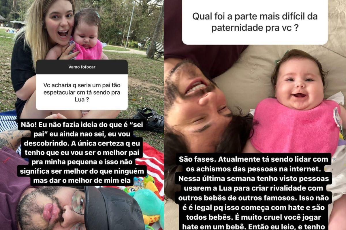 A primeira pergunta feita para o ex-BBB e pai de Lua foi: “Qual foi a parte mais difícil da paternidade para você?”. Com uma foto com a filha, Eliezer respondeu: “São fases. Atualmente está sendo lidar com o achismo da Internet. Nesta última semana eu tenho visto pessoas usarem a Lua para criar rivalidade com outros bebês de outros famosos. Não é legal porque começa com o hate, e todos são bebês. É muito cruel você jogar hate em um bebê. Então eu leio e tenho que respirar fundo, porque sei que se responder vira circo”.
