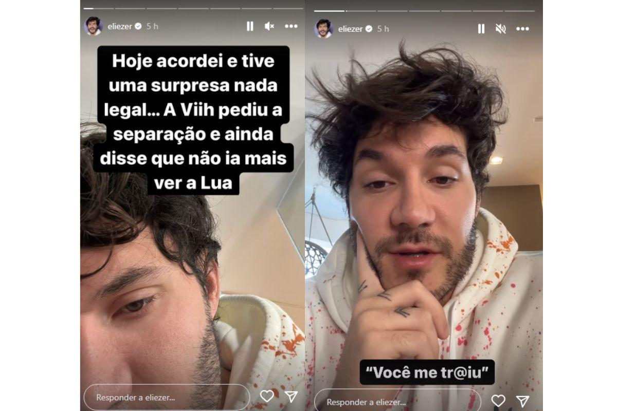 Em uma publicação nos seus stories do Instagram, Eliezer compartilhou uma foto com semblante triste na manhã desta quinta-feira, 22 de junho, e escreveu: “Hoje acordei e tive uma surpresa nada legal… A Viih pediu a separação e ainda disse que não ia mais ver a Lua”. Ele explicou que a situação começou quando acordou e tentou cumprimentar Viih Tube, mas foi ignorado. Ela o acusou de trair a própria família com uma pessoa chamada Brenda, mesmo sem ter tido nenhum contato com nenhuma pessoa nomeada por Brenda.