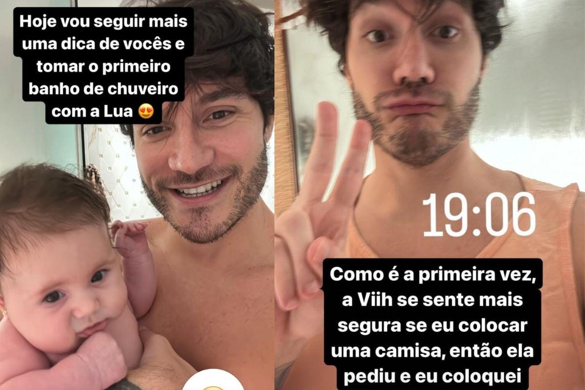 “Hoje vou seguir mais uma dica de vocês e tomar o primeiro banho de chuveiro com a Lua“, disse ele. No Story seguinte, escreveu: “Como é a primeira vez, a Viih se sente mais segura se eu colocar uma camisa, então ela pediu e eu coloquei”. Depois dos vídeos do banho, Eliezer voltou para explicar a camisa: “Gente, a camisa foi só para evitar a Lua de escorregar, já que eu nunca tinha dado banho assim (sempre foi só na banheira). Só foi um cuidado a mais”.