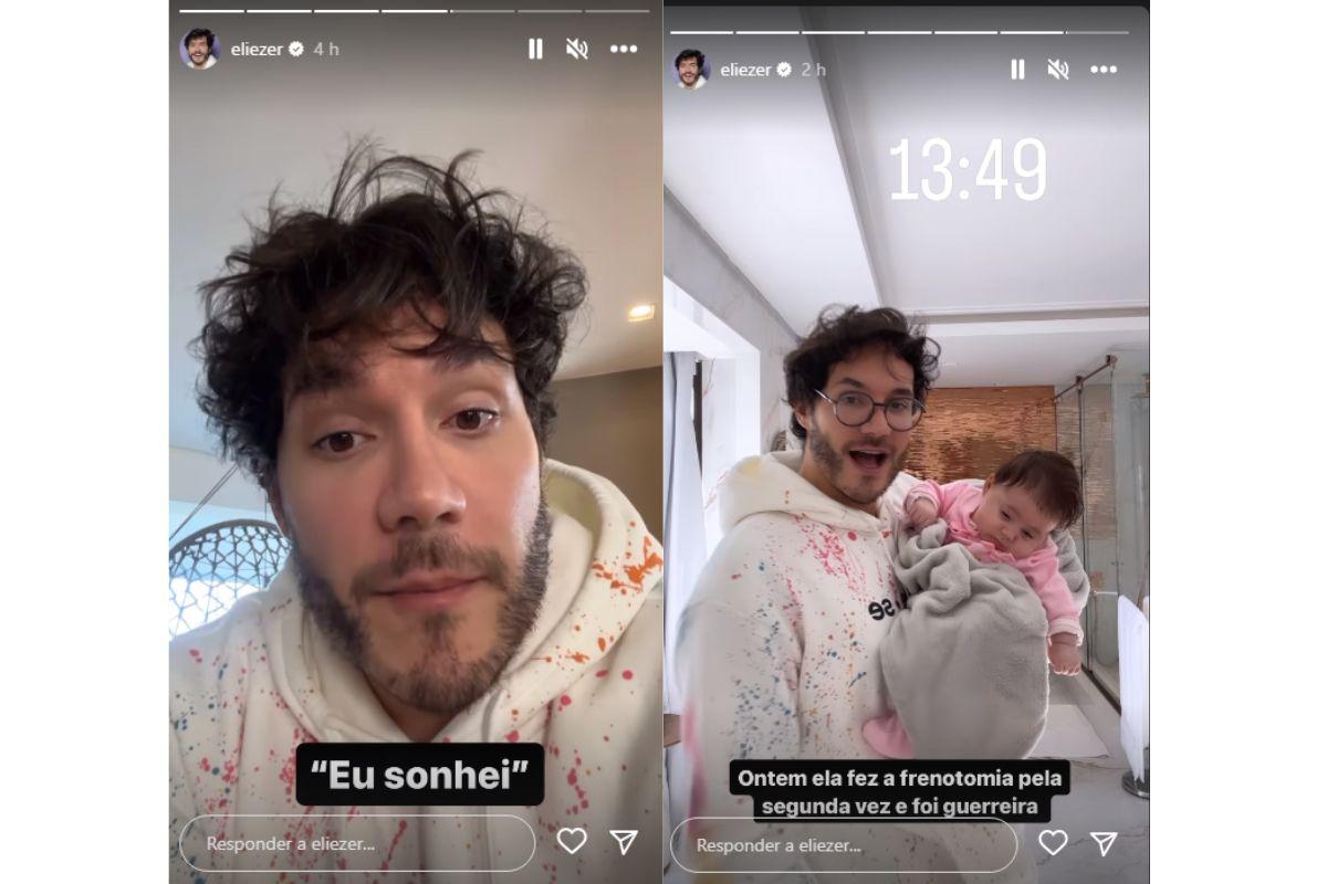Após desabafar sobre noites de sono difíceis para a filha, Lua, Eliezer compartilhou um vídeo e foto nos stories do Instagram para comemorar que a bebê teve uma boa noite de sono. Com ela no colo, o influenciador brincou sobre a situação e até fez uma música.