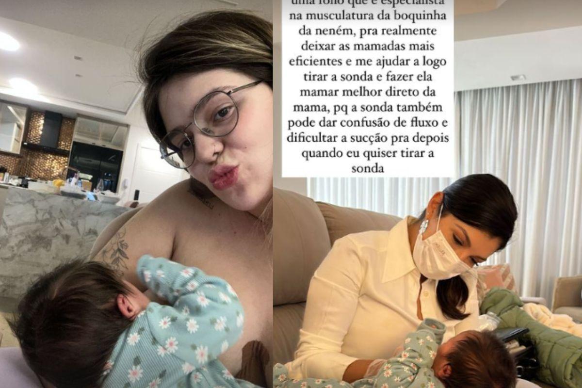 Recentemente a influenciadora usou as redes sociais para contar sobre um procedimento médico que a filha passou. A recém-nascida começou um tratamento com uma fonoaudióloga para retirar a sonda, que ajuda ela na hora da amamentação.