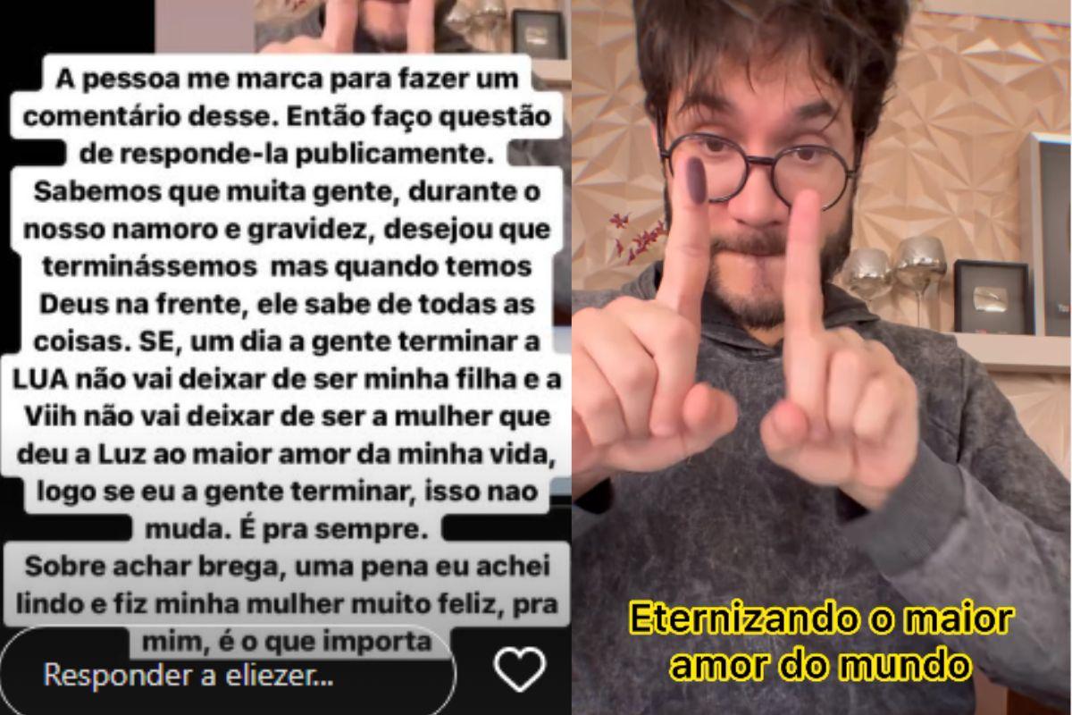 Na tatuagem ele colocou as digitais dele, de Viih e do pé da filha recém-nascida. Apesar dos elogios, uma internauta foi até a publicação e fez um comentário que desapontou o pai de primeira viagem. “Primeiro, que brega. Segundo, e quando terminar com ela [Viih tube]?”, disse a seguidora. Eliezer não deixou passar e resolveu respondê-la publicamente. “A pessoa me marca para fazer um comentário desse. Eu faço questão de respondê-la publicamente”, começou ele.