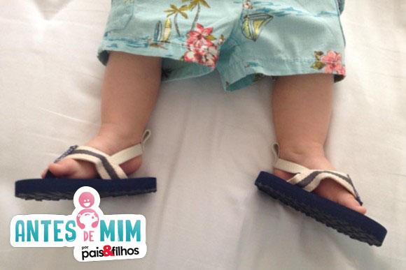 Mateo usou a peça na primeira vez que foi ao clube. O look foi todo produzido, tendo também esse chinelo combinando. “Ele tinha três meses e ficou parecendo um mini homem”, lembra.