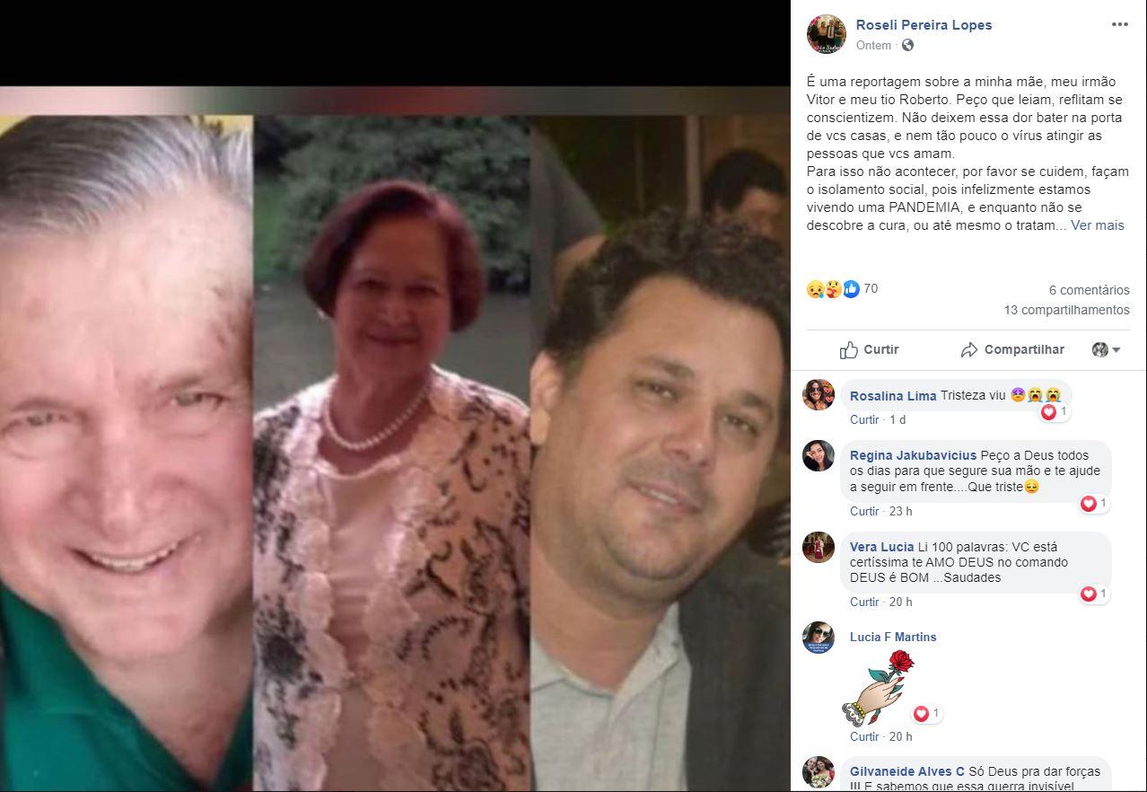 “No dia 5 de abril ao meio dia ligaram para a casa do meu irmão que estava internado, solicitando um familiar na unidade. Pensamos que o médico ia adiantar a visita, mas a minha mãe tinha morrido e no mesmo dia meu irmão foi intubado. Na sexta, dia 10 de abril, chamaram para alguém ir até o hospital com o documento dele. Eu já sabia”, disse Roseli.