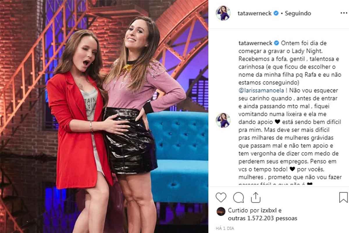 Por causa da gentileza da atriz, Tatá postou uma foto ao lado de Larissa e escreveu: “Ontem foi dia de começar a gravar o Lady Night. Recebemos a fofa, gentil , talentosa e carinhosa (e que ficou de escolher o nome da minha filha pq Rafa e eu não estamos conseguindo) @larissamanoela ! Não vou esquecer seu carinho quando, antes de entrar e ainda passando muito mal , fiquei vomitando numa lixeira e ela me dando apoio ❤️ está sendo bem difícil pra mim. Mas deve ser mais difícil pras milhares de mulheres grávidas que passam mal e não tem apoio e tem vergonha de dizer com medo de perderem seus empregos. Penso em vocês o tempo todo! ❤️ por vocês, mulheres , prometo que não vou fazer parecer fácil o que não é ❤️”, contou a comediante.