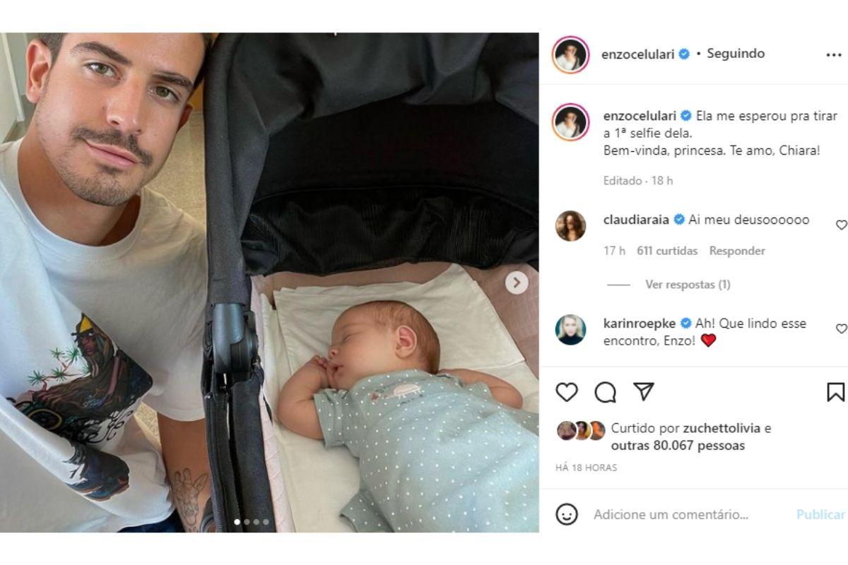 Na legenda, Enzo brincou sobre o momento e contou que a irmã estava o esperando para tirar a primeira selfie da vida. “Ela me esperou pra tirar a 1ª selfie dela. Bem-vinda, princesa. Te amo, Chiara!”, declarou ele, na legenda da publicação.