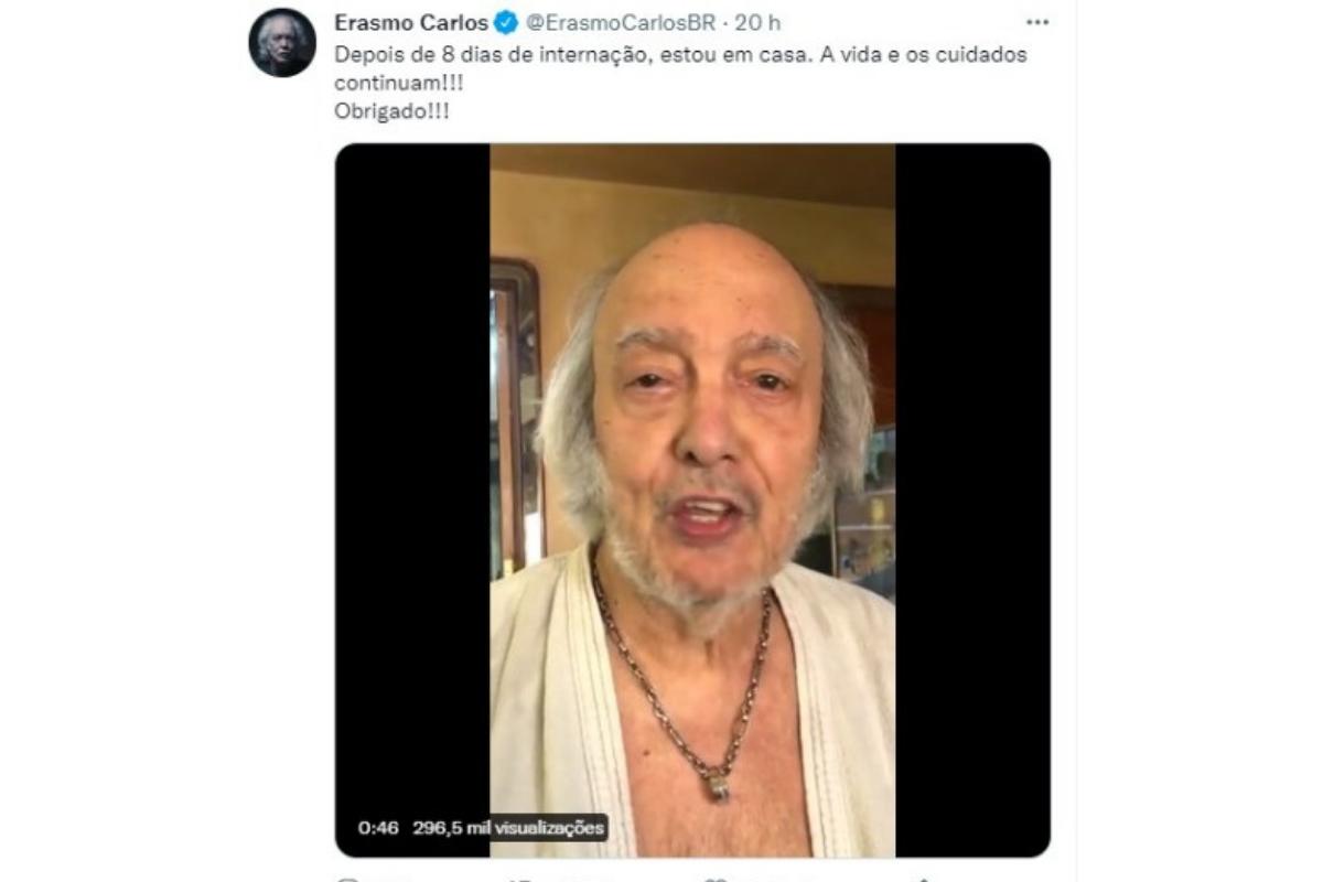 Erasmo Carlos, de 80 anos, recebeu alta hospitalar e já está em casa. O artista tinha sido internado para tratar a Covid-19, por conta da idade. Nesta última terça-feira, 7 de setembro, ele comemorou estar em casa depois de 8 dias de internação, publicando um vídeo no Twitter.