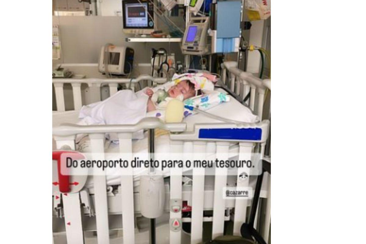 Logo após chegar no hospital, a mãe compartilhou uma foto mostrando a filha dela: “Do aeroporto direto para o meu tesouro’’, escreveu Letcia em um post nos stories do Instagram.