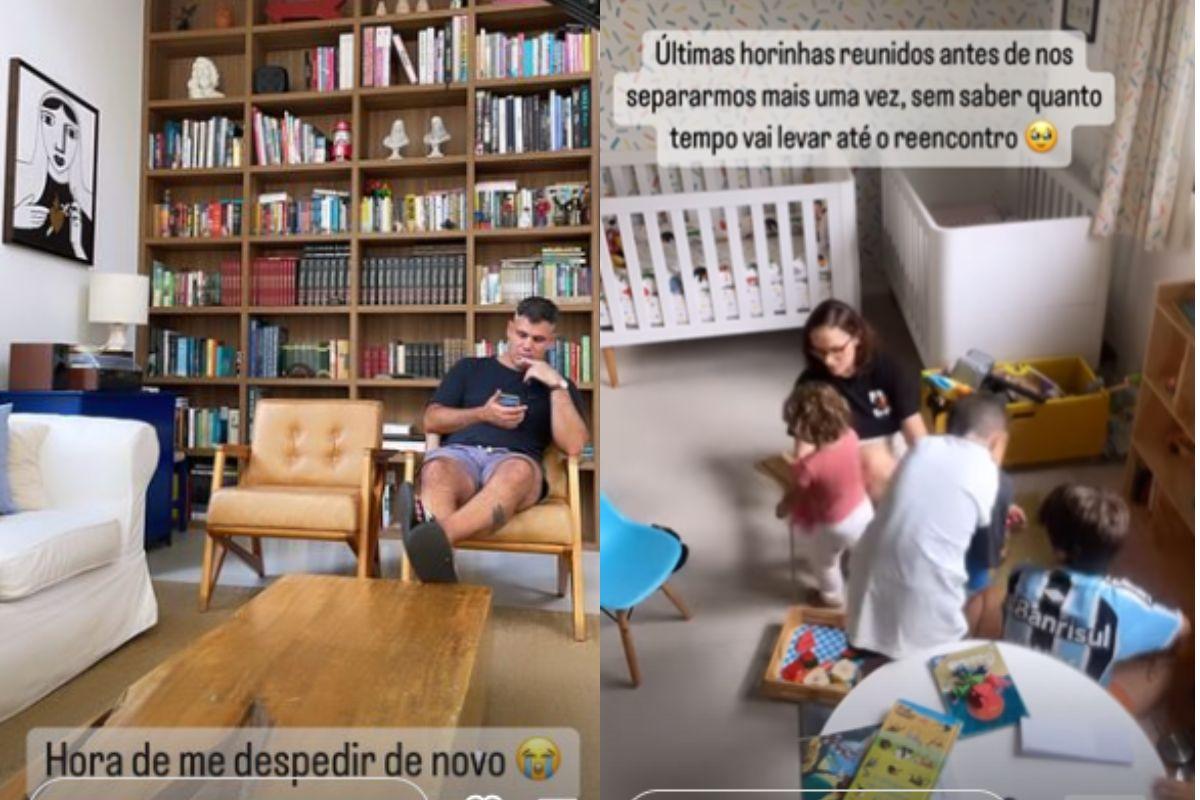 “Hora de me despedir de novo”, disse ao postar foto de Juliano sentado mexendo no celular. Em seguida, ela compartilhou um vídeo de um momento de brincadeira com as crianças, Vicente, de 12 anos, Inácio, 9, Gaspar, de 3, e Maria Madalena, de um aninho. “Últimas horinhas reunidos antes de nos separarmos mais uma vez, sem saber quanto tempo vai levar até o reencontro”, comentou Letícia em uma publicação do Instagram