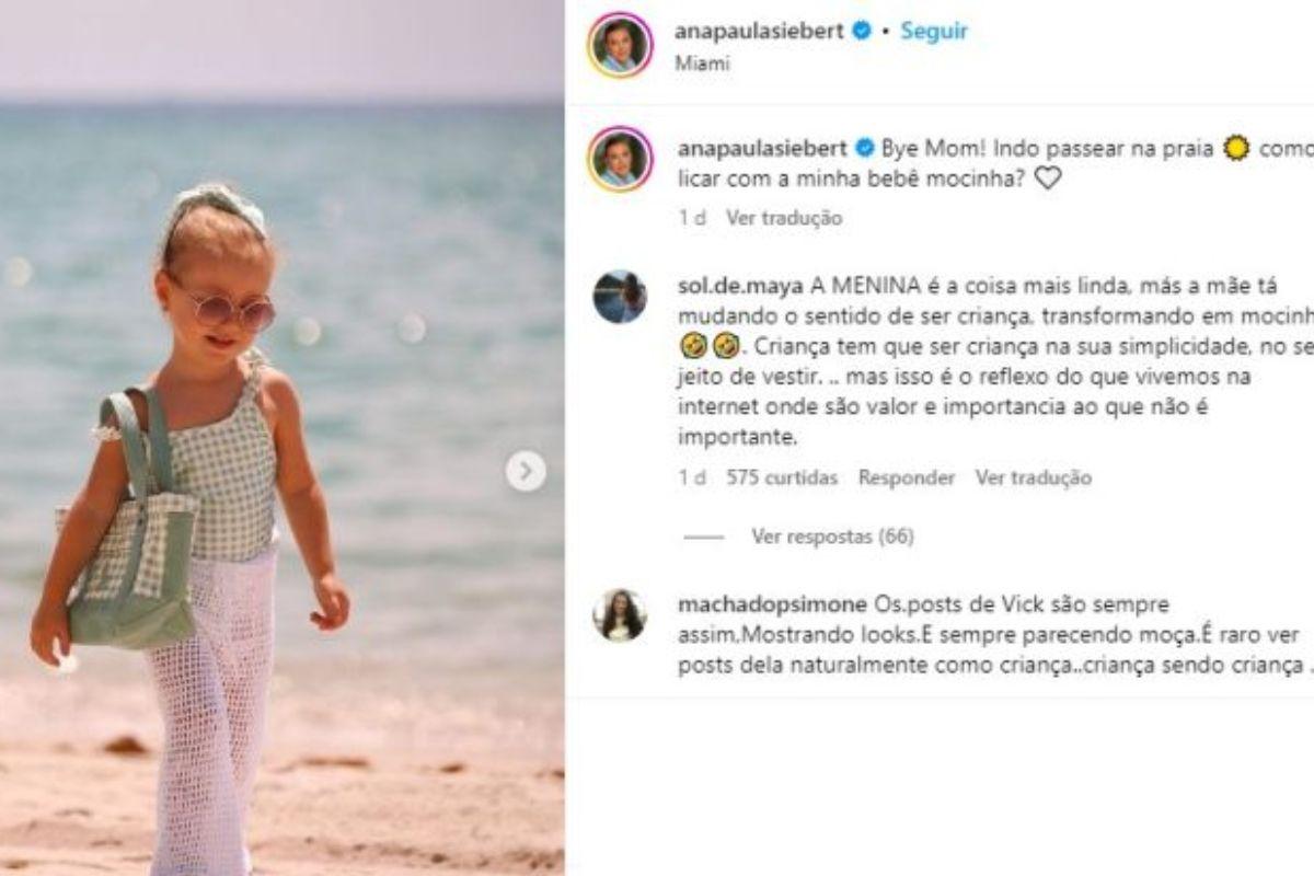 Nas imagens a menina aparece na praia usando um óculos de sol, blusa xadrez verde e uma calça transparente. Entretanto, nos comentários da postagem diversos seguidores falaram sobre a escolha de Ana para as roupas da filha.