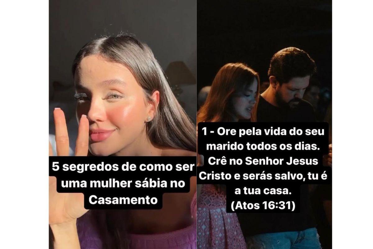 “5 segredos de como ser uma mulher sábia no casamento”, legendou ela no início do vídeo publicado por meio do Instagram. Na sequência, as ‘dicas’ começaram a aparecer. “1- Ore pela vida do seu marido todos os dias. Crê no Senhor Jesus Cristo e serás salvo, tu é a tua casa (Atos 16:31)”, iniciou.