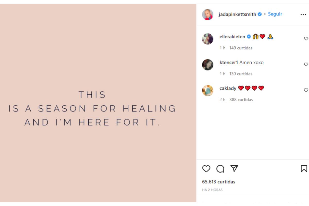 Depois de publicar um card com a frase escrita em inglês, Jada limitou a quantidade de comentários da publicação. A foto já acumulou mais de 60 mil curtidas, mas segue com poucos comentários, apenas aqueles que ela permite aparecer.