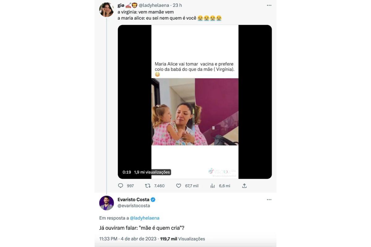 Nesta quarta-feira, 5 de abril, Virginia Fonseca e o marido, Zé Felipe, rebateram um comentário feito pelo jornalista Evaristo Costa sobre a criação das filhas do casal, e o assunto foi um dos mais comentados durante a manhã. Evaristo publicou um comentário sobre um vídeo em que Maria Alice pede o colo da babá invés do colo da mãe na hora de tomar vacina.