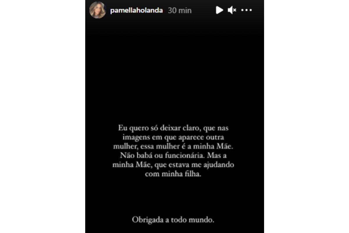 “Eu quero só deixar claro, que nas imagens em que aparece outra mulher, essa mulher é minha Mãe. Não é babá ou funcionária. Mas a minha Mãe, que estava me ajudando com minha filha”, esclareceu ela. “Obrigada a todo mundo”, completou, agradecendo.