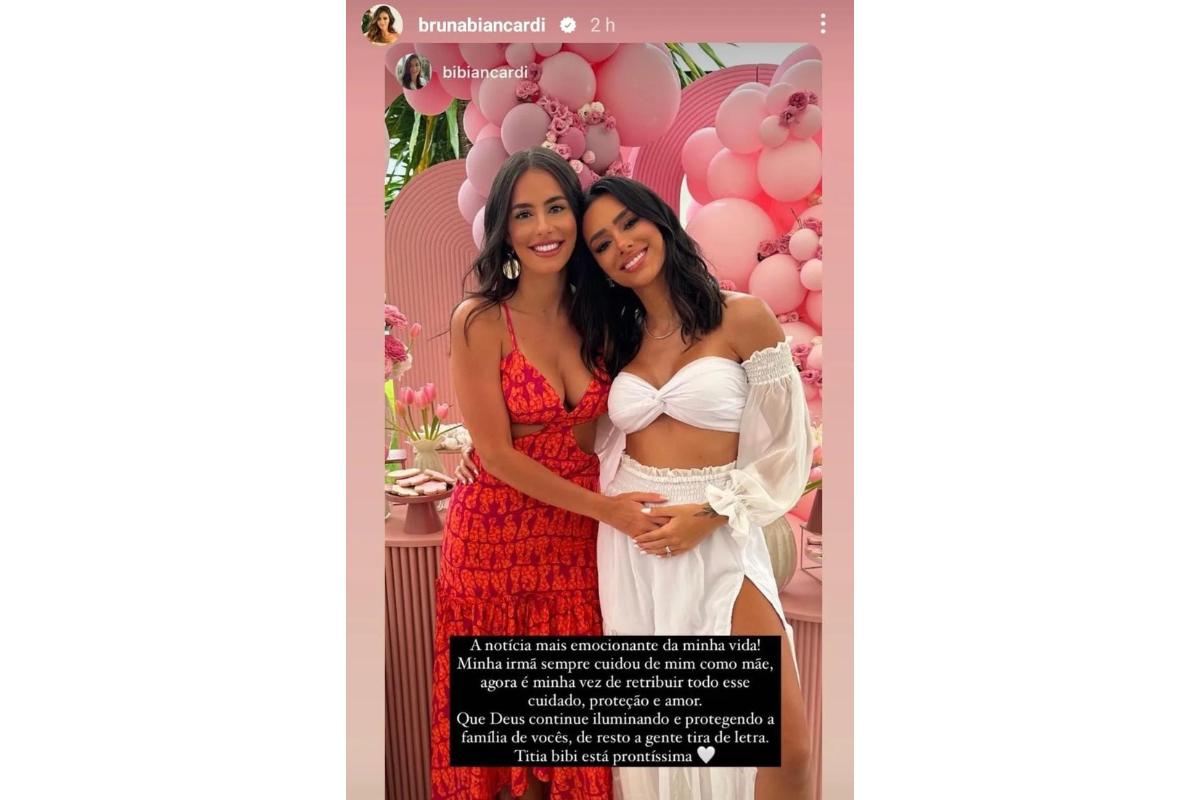 “A notícia mais emocionante da minha vida! Minha irmã sempre cuidou de mim como mãe, agora é minha vez de retribuir todo esse cuidado, proteção e amor. Que Deus continue iluminando e protegendo a família de vocês, de resto a gente tira de letra. Titia Bibi esta prontíssima”, escreveu Bianca em um post feito nos stories do Instagram.