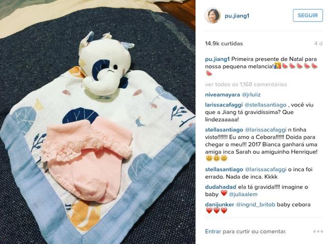 A ex-participante do MasterChef Jiang Pu surpreendeu ao postar a foto de presentes para bebê no Natal. Na legenda, ela entregou o motivo: “primeiro presente para nossa pequena melancia”. Jiang está casada desde agosto com Ricardo Matioli.