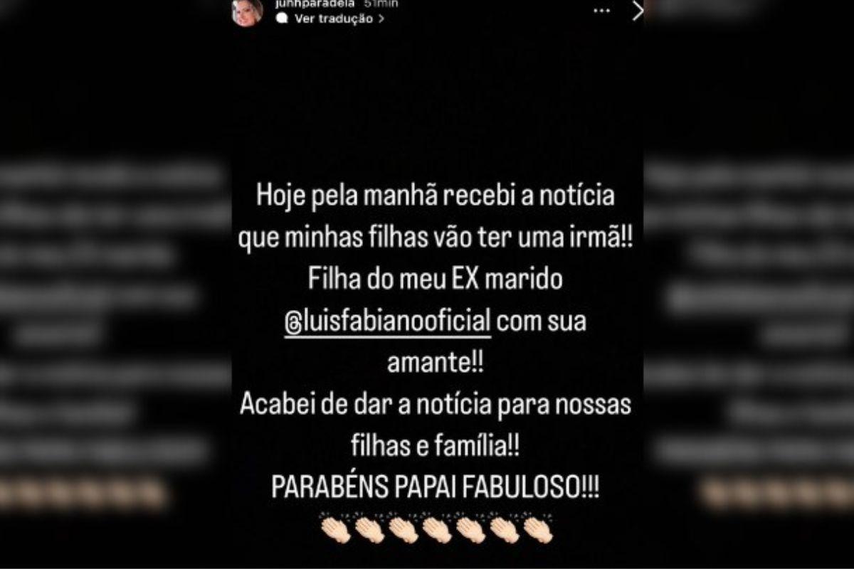 Nesta quinta-feira, dia 09 de março, Juliana Paradelas usou as suas redes sociais para compartilhar que o ex-jogador Luis Fabiano terá um filho fora do casamento. Em uma publicação realizada nos Stories do Instagram, ela ironizou o craque e se referiu ao atleta como ex-marido, afirmando que já contou para as filhas sobre o ocorrido.