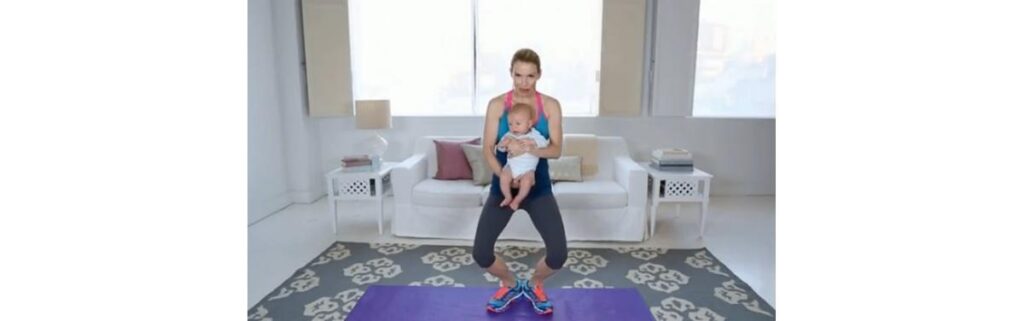 A) Fique em pé, segurando seu bebê de costas para você. Junte os calcanhares e aponte os dedos dos pés para fora. Dobre os joelhos lentamente e desça o quadril em linha reta, em plié.